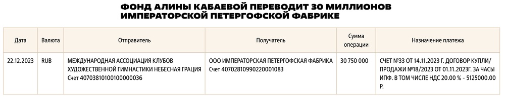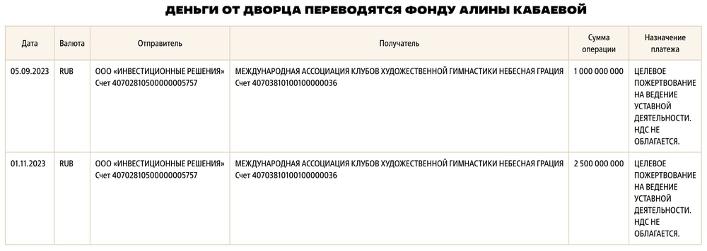 4 апреля 2023 года компания «Инвестиционные Решения» пожертвовала 500 миллионов рублей Фонду Алины Кабаевой. 1 ноября — еще 2,5 миллиарда, то есть всего 3.