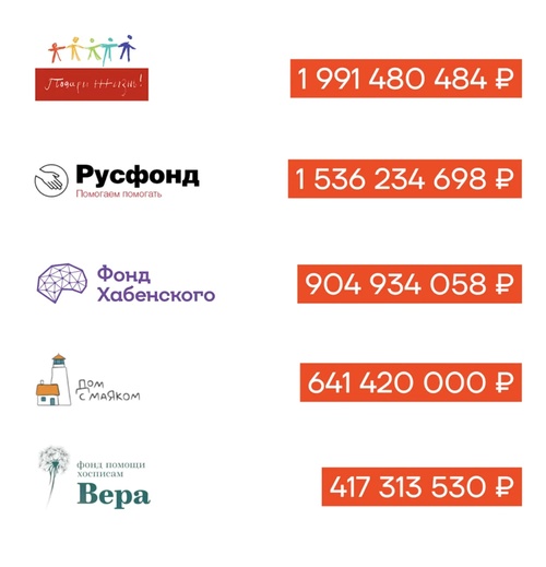 «Русфонд», его сборы смсками вы каждый день видите по телевизору, собрал 1,5 миллиарда, то есть на 5 миллиардов меньше, чем пылится на счетах Кабаевой. К сборам «Подари жизнь» и «Русфонда» можно добавить еще фонд Хабенского, фонд «Дом с Маяком», фонд «Вера».